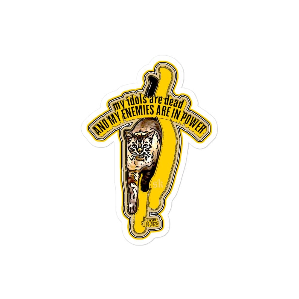 "my idols are dead and my enemies are in power" captioning an image of Browser the library cat.